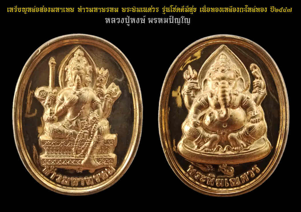 เหรียญหล่อสองมหาเทพ ท้าวมหาพรหม พระพิฆเนศวร หลวงปู่หงษ์ พรหมปัญโญ วัดเพชรบุรี สุรินทร์ รุ่นโชคดีมีสุข ตอก2โค้ด เนื้อทองเหลืองกะไหล่ทอง ปี2547 กล่องเดิม
