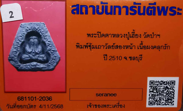 พระปิดตาหลวงปู่เฮี้ยง วัดป่าฯ พิมพ์ซุ้มเถาวัลย์สองหน้า เนื้อผงคลุกรัก ปี2510 จ.ชลบุรี + บัตรG-pra สภาพเดิมค่ะ |