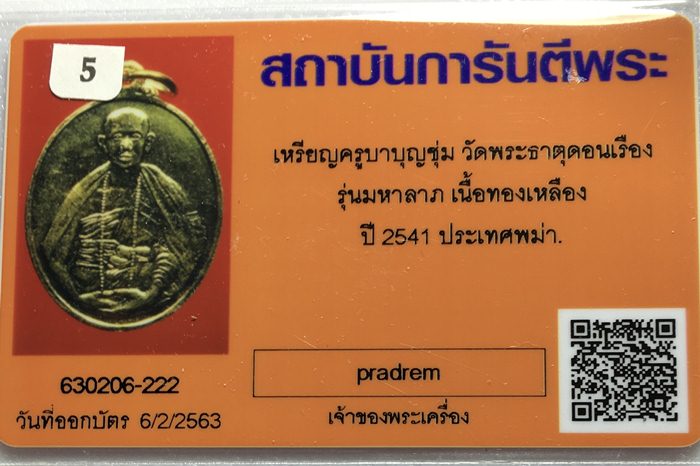 "วัดใจ" เหรียญครูบาบุญชุ่ม วัดพระธาตุดอนเรือง เมืองพง รัฐฉาน ประเทศพม่า รุ่นมหาลาภ เนื้อทองเหลืองหลังป.อ. ปี 2541 สวยแชมป์ พร้อมบัตรการันตีพระ