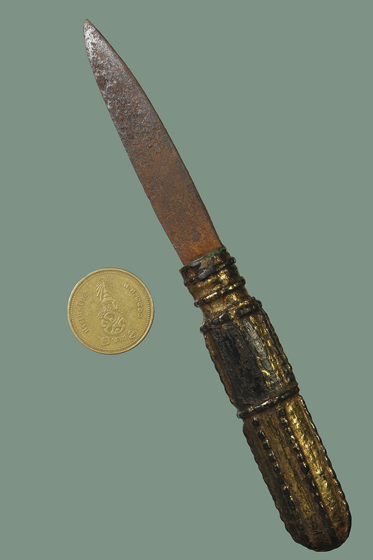 วัดใจ**เครื่องราง มีดหมอ ใบเหล็ก*{ ด้ามไม้ลงรักทาทอง+อุดชันโรงเก่า }*ยาว 5.5นิ้ว ไม่ทราบที่ ไม่มีฝัก....ตามสภาพครับ |