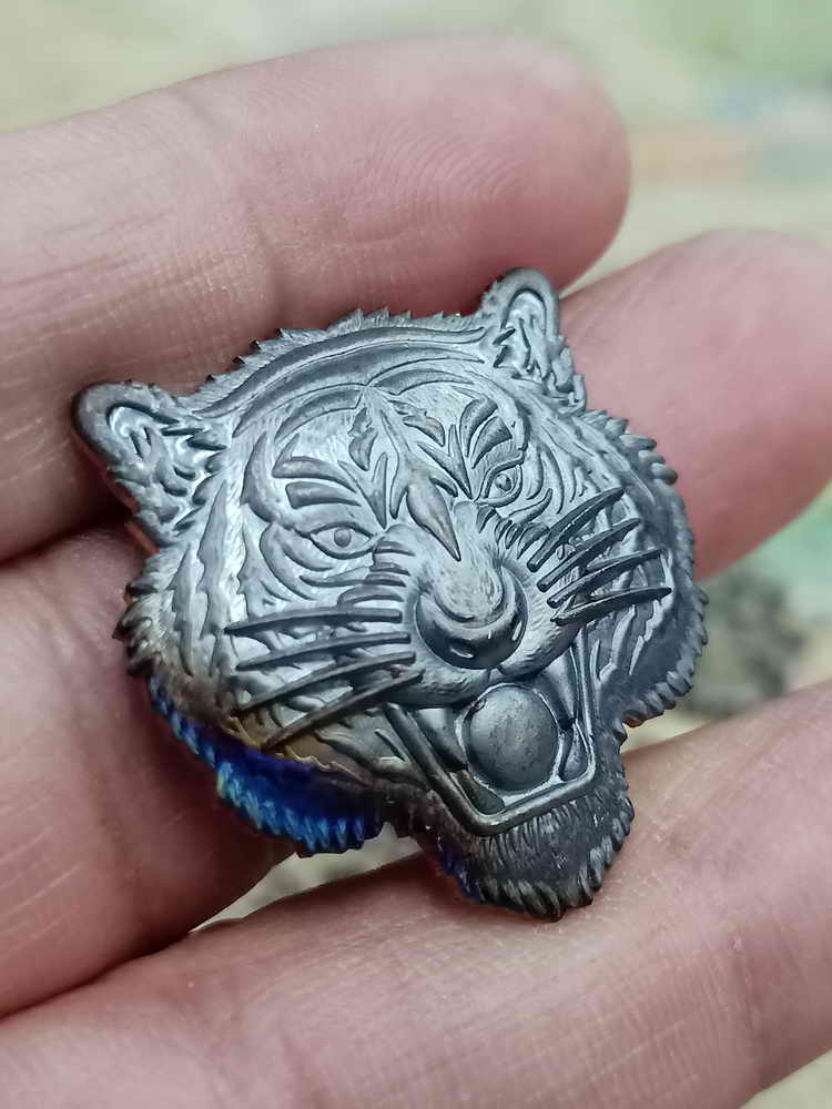วัดใจ 100 เหรียญหัวเสือคาบแก้ว หลวงปู่เถิง วัดบ้านอาลัย จ.ศรสะเกษ 2567 ทองแดงรมดำ หลังเพ้นท์ หมายเลข 28 กล่องเดิม