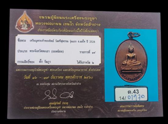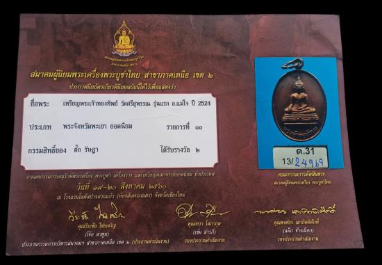 เริ่มที่ 200 สภาพนี้หาแทบไม่ได้แล้วสวยๆผ่านงานประกวดพระเชียงใหม่และลำปางได้ที่2 จัดส่งพร้อมใบประกาศ เหรียญรุ่นแรกพระเจ้าทองทิพย์ วัดศรีสุพรรณ พระเจ้าทองทิบ้านคู่เมืองของอำเภอแม่ใจ จังหวัดพะเยา ปี2524 |