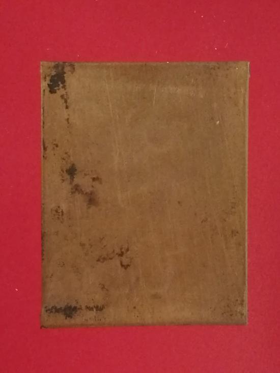 รูปถ่าย ขนาดห้อยคอ จับขอบแผ่นทองแดง หลังจารมือ ไม่ทราบที่ครับ |