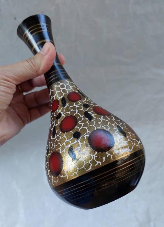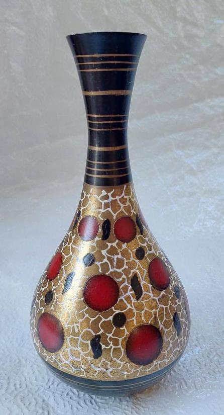 ***วัดใจ***แจกันเก่าทรงโบราณ เนื้อโลหะ เพ็นลายทองจุดแดง สูง 8 นิ้ว