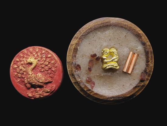 พญายูงคำ รุ่นแรก เนื้อแดงปัดทอง และ ตลับไม้สีผึ้งเนื้อหอม รังผึ้งร้าง ขวางเดือนขวางตะวัน รุ่นแรก ฝังอิ่น ตะกรุด ในเมตตาบารมี เจ้าปู่จั่นต่า กาวิสาละ พญานกยูง ขนาดเท่าเหรียญสิบบาท