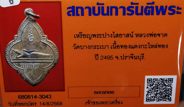 (วันอังคาร)เหรียญพระปางไสยาสน์ หลวงพ่อจาด วัดบางกระเบา เนื้อทองแดงกะไหล่ทอง ห่วงเดิม ปี2495 จ.ปราจีนบุรี + บัตรG-pra สภาพเดิมค่ะ สภาพตามรูปทุกประการค่ะ |