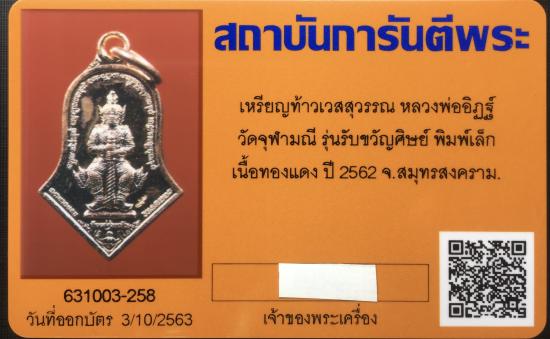 เหรียญท้าวเวสสุวรรณโณ พิมพ์จำปีเล็ก รุ่น รับขวัญศิษย์ หลวงพ่ออิฏฐ์ วัดจุฬามณี ปี 62 เนื้อทองแดง พร้อมกล่อง |