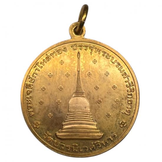 ด้านหลังของเหรียญเป็นรูปพระเจดีย์กาไหล่ทอง บรรจุพระบรมสารีริกธาตุ ณ วัดบวรนิเวศวิหาร