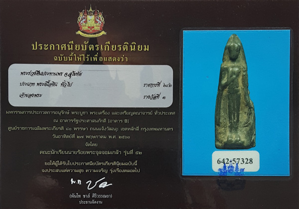 พระร่วงยืนประทานพร พิมพ์เล็ก เนื้อชินเงิน กรุวัดมหาธาตุ สุโขทัย หายาก มาพร้อมใบประกาศรางวัลที่ 3 งานสมาคมครับ