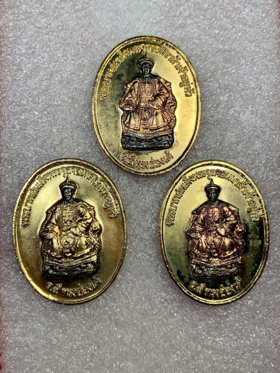 ((แดงที่100))เหรียญ ร.5 ทรงฮ่องเต้ จัดสร้างโดยสถาบันเทคโนโลยีราชมงคล ปี 2547 กะไหล่ทองสามกษัตริย์ (3เหรียญ)