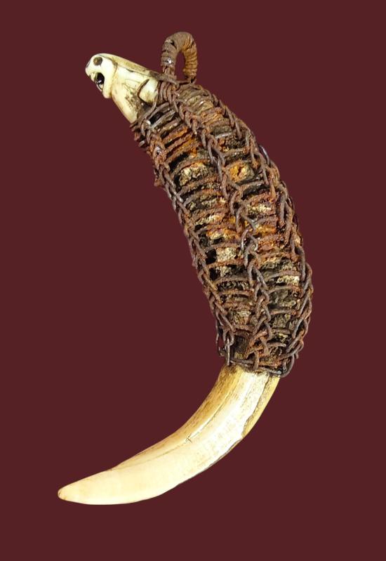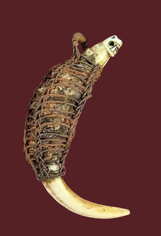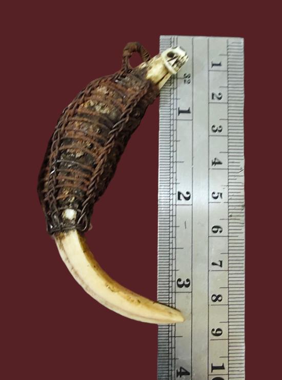 เขี้ยวหมูป่าตันแกะรูปเสือ พอกผงถักลวดเก่า |