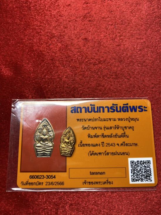 พระนาคปรกใบมะขาม หลวงปู่หมุน วัดบ้านจาน รุ่นเสาร์ห้าบูชาครู พิมพ์ตาขีดหลังยันต์ตื้น เนื้อทองแดง ปี 2543 จ.ศรีสะเกษ. (โค้ดเฑาว์สายฝนนอน) |