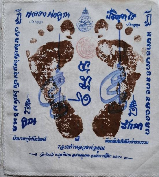มาคู่ ผ้ายันต์ รอยมือ + รอยเท้า หลวงพ่อคูณ ปริสุทโธ วัดบ้านไร่ นครราชสีมา ปั๊มตราวัด ปี 2551 เเบบสกรีน ( พร้อมรอยจารหลวงพ่อทองศิษย์หลวงพ่อคูณ วัดบ้านไร่ เมตาจารหมึกให้ครับ )