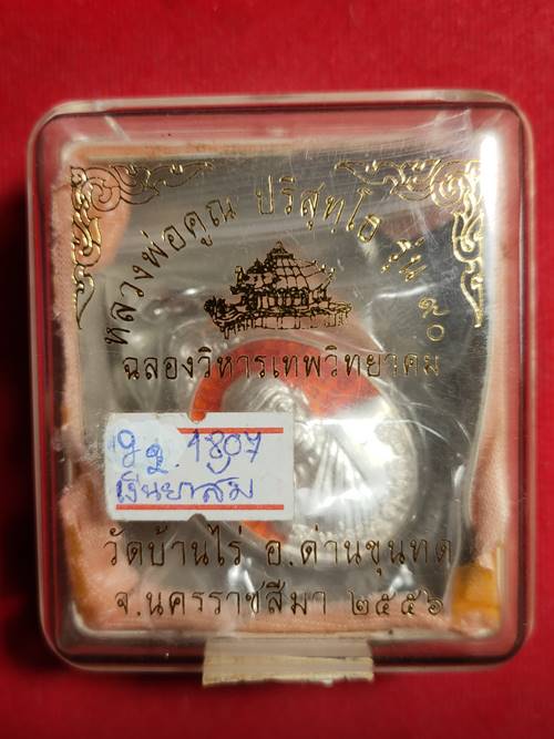 เหรียญหลวงพ่อคูณ ปริสุทโธ รุ่น ฉลองวิหารเทพ ออกวัดบ้านไร่ ปี 56 เนื้อ เงินลงยาสีส้ม หมายเลข 1807 เลี่ยมพร้อมใช้ เคาะเดียวแดง