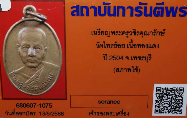 เหรียญพระครูวชิรคุณารักษ์ วัดไทรย้อย เนื้อทองแดง ห่วงเดิม ปี2504 จ.เพชรบุรี + บัตรG-pra |