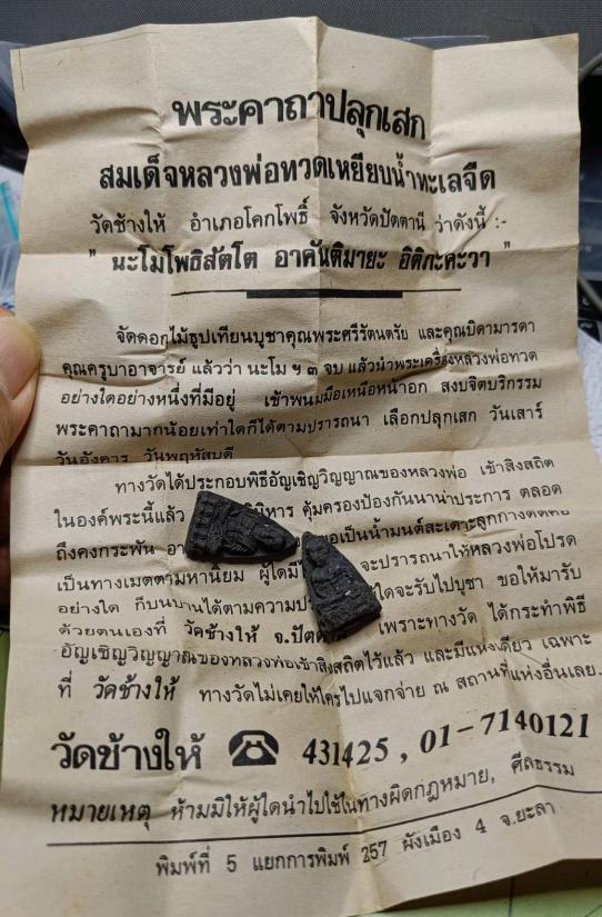 พระเนื้อว่าน พิมพ์เล็ก รุ่นปลอดหนี้ หลวงปู่ทวด (อาจารย์นอง)ปี 2537พร้อมใบคาถาและซองเดิม 2 องค์เบาๆค่ะ