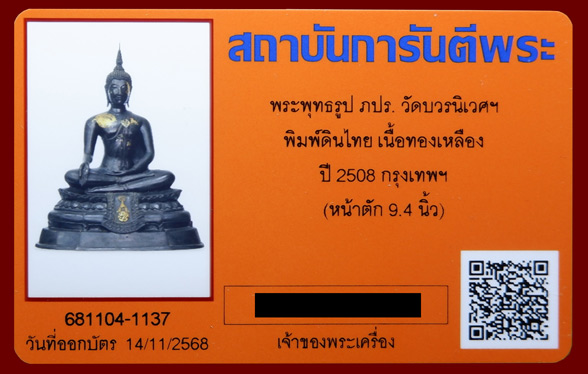 ชื่อพระเครื่อง พระบูชา (ภปร.) รุ่นแรกวัดบวร หน้าตัก 9นิ้ว! เนื้อทองเหลือง หล่อหนา นิยม (พิมพ์ดินไทย) ปี2508 ฐานตะปู มีลวดขึ้นหุ่นพระ หล่อในพิธี สุดยอดหายาก! + บัตรรับรอง G-PRA