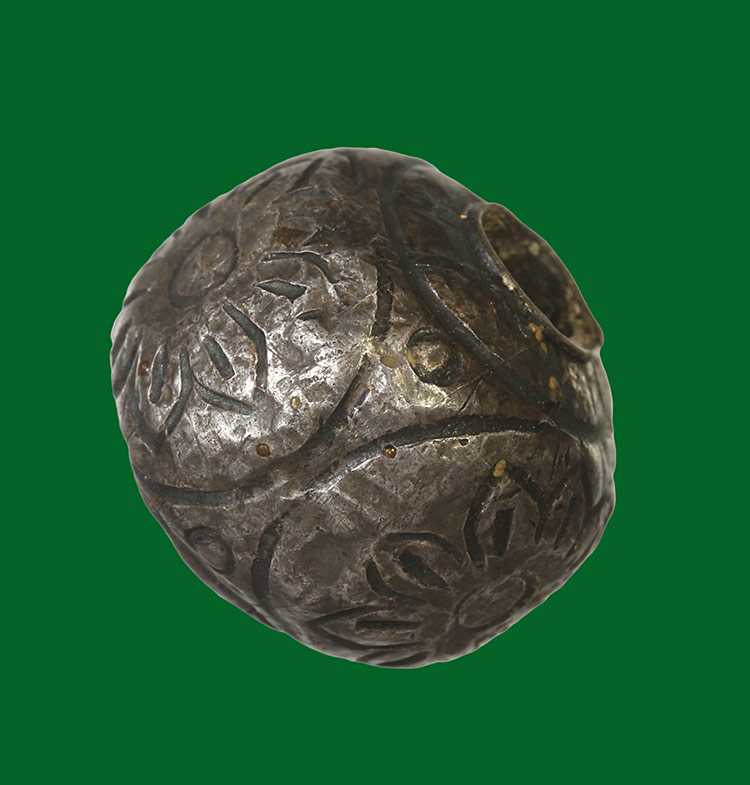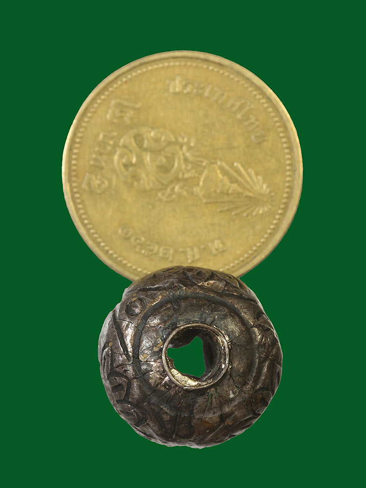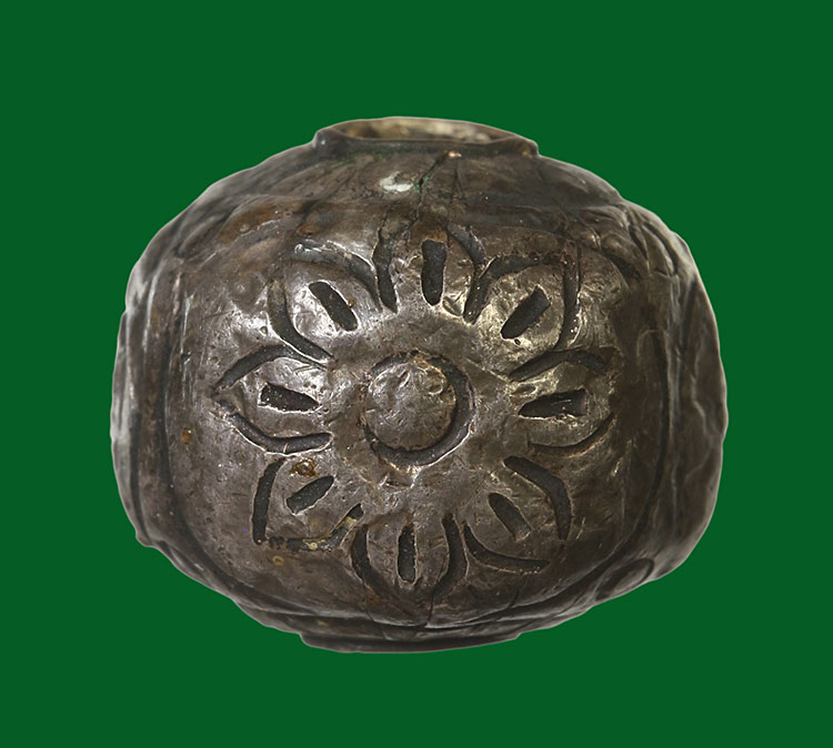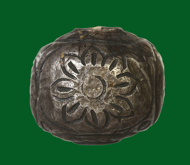 วัดใจ**เครื่องราง เม็ดประคำเนื้อผงยาหุ้มเงินโบราณแกะลายเก่า ไม่ทราบที่....ตามสภาพครับ