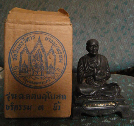 สมเด็จพระพุฒาจาร์ยโต รมดำ 3 นิ้ว ออกวัดอินทรวิหาร รุ่นฉลองพระอุโบสถ ปี 2537 เป็นพระที่สร้างปีเดียวกันกับพระวัดระฆังรุ่น อนุสรณ์ 122 ปี คณาจาร์ยปลุกเสกมากมาย แต่กล่องในรูปทำหายไปแล้วไม่มีให้ |