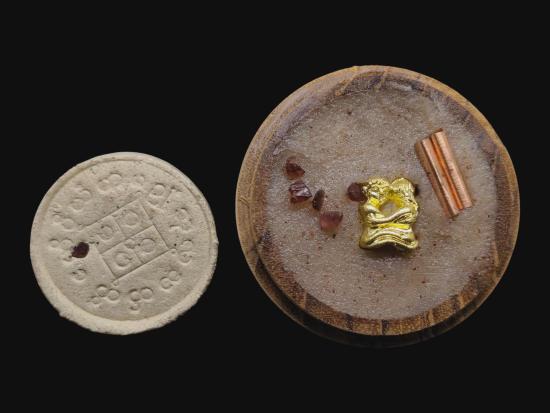 เคาะเดียวแดง พญายูงคำ รุ่นแรก เนื้อเกสรทั้งห้า และ ตลับไม้สีผึ้งเนื้อหอม รังผึ้งร้าง ขวางเดือนขวางตะวัน รุ่นแรก ฝังอิ่น ตะกรุด ในเมตตาบารมี เจ้าปู่จั่นต่า กาวิสาละ ครูบากฤษดา เมตตาเษก |