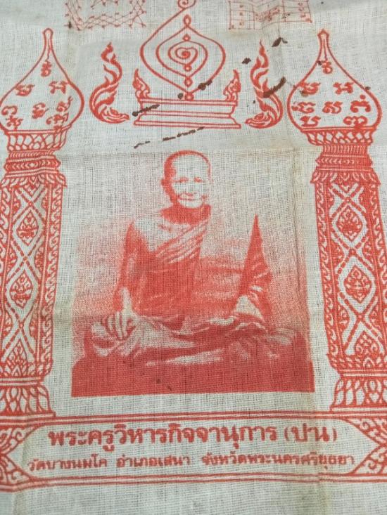 ด้วยผ้าขาวและพิมพ์สกีนรูปหลวงปู่ปานด้วยหมึกสีแดง |