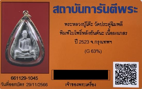 ชื่อพระเครื่อง หลวงปู่โต๊ะ วัดประดู่ฉิมพลี พิมพ์ใบโพธิ์หลังยันต์นะ เนื้อผงเกสร เลี่ยมทอง + บัตร G