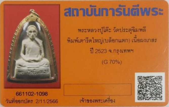 ชื่อพระเครื่อง หลวงปู่โต๊ะ วัดประดู่ฉิมพลี พิมพ์เตารีดใหญ่ เนื้อผงเกสร เลี่ยมทอง + บัตร G