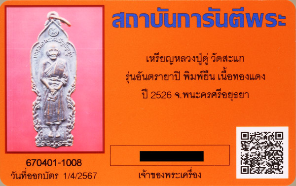 เหรียญหลวงปู่ดู่ วัดสะแก รุ่นอันตรายาปิ พิมพ์ยืน เนื้อทองแดง ปี 2526 พร้อมบัตรรับรองการันตรีพระ