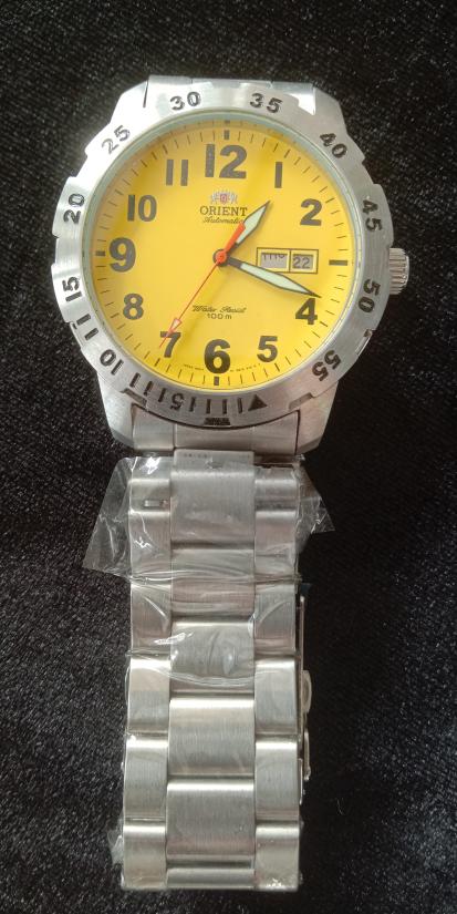 Orient Automatic หน้าปัดสีเหลือง สายสแตนเลสสตีล กันน้ำลึก 100 เมตร สภาพใหม่เก่าเก็บพลาสติกซีนสายยังอยู่ครบ