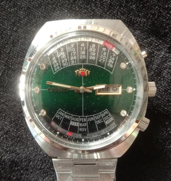 นาฬิกา orient รุ่นปฏิทิน 100 ปีขนาดหน้าปัด 43 มม สีเขียว ระบบ automaticกันน้ำลึก 50 เมตร สภาพใหม่เก่าเก็บซีนเดิมยังอยู่ครบ สวยพร้อมใช้งาน