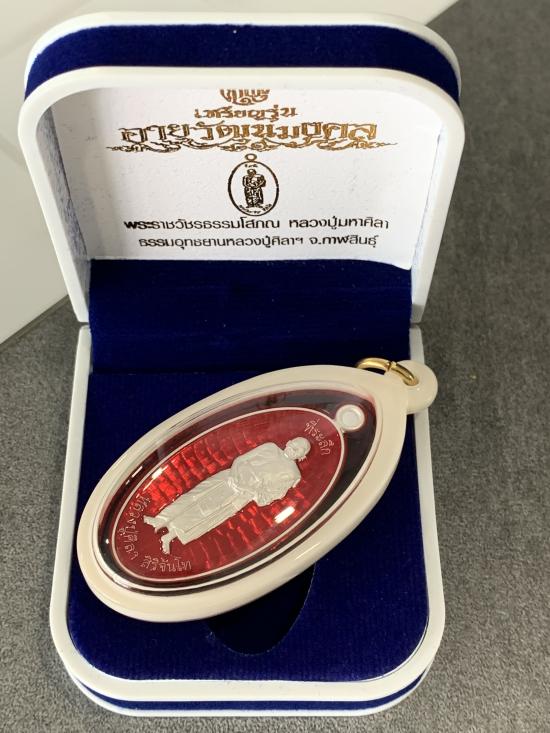 ชื่อพระเครื่อง หลวงปู่มหาศิลา รุ่นอายุวัฒนมงคล พิมพ์ยืน เนื้อเงินลงยาสีแดง เบอร์ 856 พร้อมกล่องเดิม ๆ เลี่ยมกันผิวพร้อมใช้ จ.กาฬสินธุ์