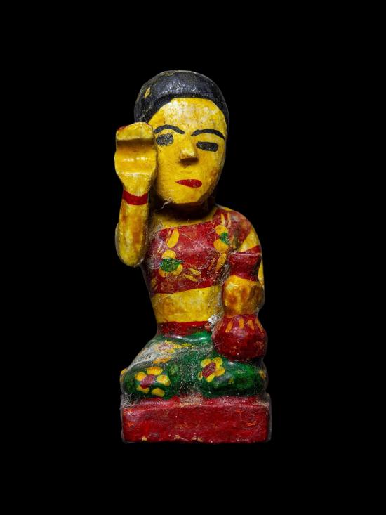 นางกวักหลวงพ่อย้อย วัดใหม่สุคนธาราม จ.นครปฐม เคลือบแชแล็ค สีฝุ่น จัดอยู่ในชุดเครื่องรางยอดนิยม จ.นครปฐม นางกวักหลวงพ่อแกะมาจากไม้ตะเคียนตายพรายหรือยืนต้นตายที่วัดท่าน จัดเป็นไม้ที่มีอาถรรพ์แรงหาไม่ได้ง่ายๆ ศิลป์นิยมครูเรือนขนตางอน สภาพสวย |