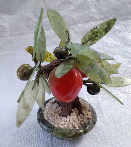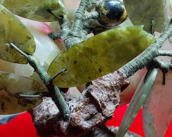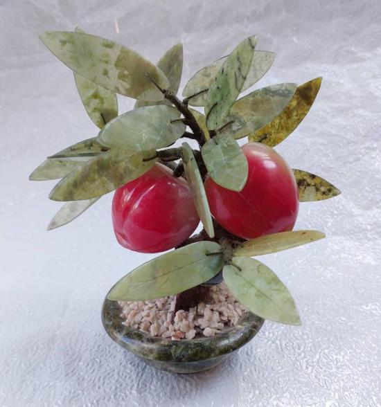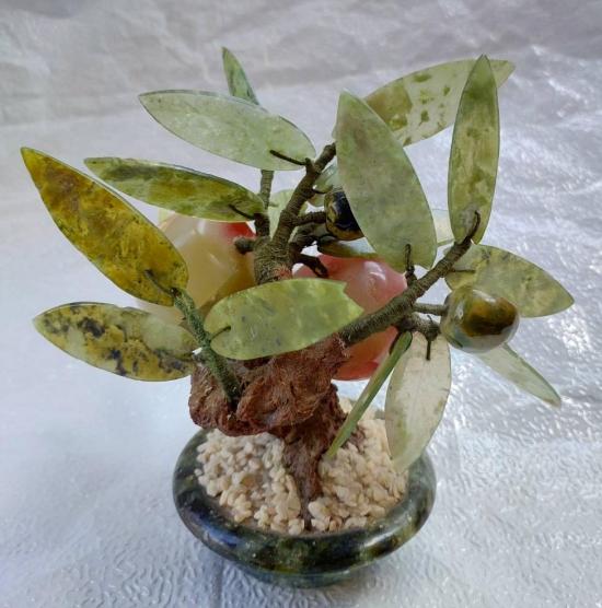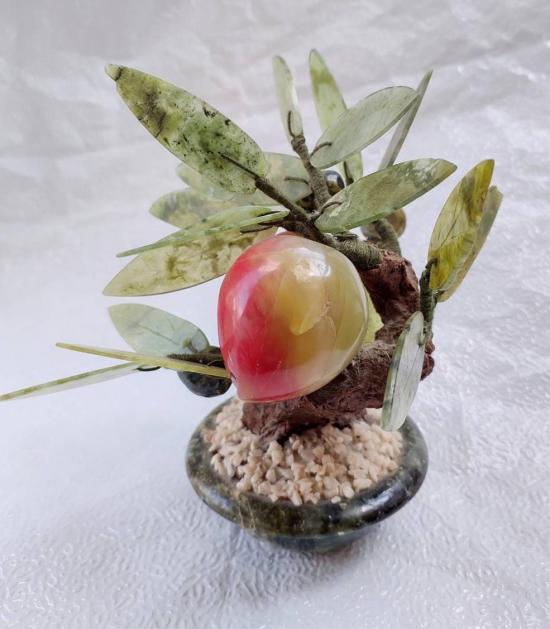 ต้นท้อหยกบอนไซ ซึ่งเป็นงานฝีมือที่ทำจากหินหยกและหินควอตซ์ สูงประมาณ 8นิ้ว