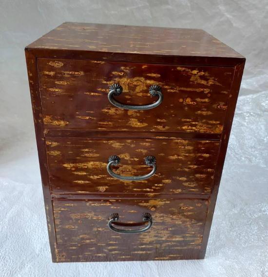 กล่องไม้วินเทจญี่ปุ่น งานฝีมือเก่า 3 ลิ้นชัก สามารถวางพระบูชา 5 นิ้วได้ ขนาด 18 x 22 x สูง 30 ซม.ทำจากเปลือกเชอร์รี่(ต้นซากุระ)รอบใบ