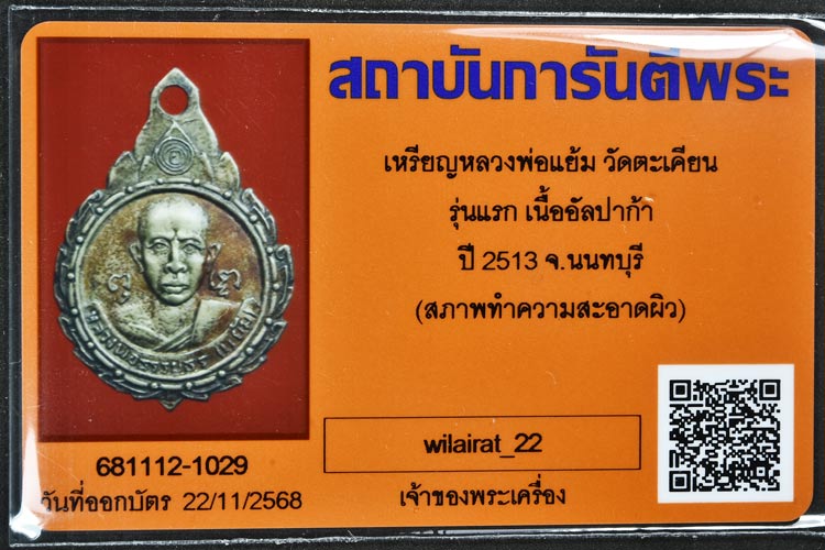 เหรียญหลวงปู่แย้ม วัดตะเคียน รุ่นแรก เนื้ออัลปาก้า ปี13 พร้อมบัตรรับรอง