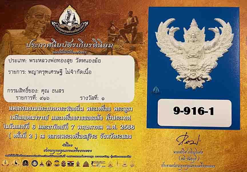 แชม์ที่ 1 งานระยอง ปี 2566 *** พญาครุฑ รุ่นแรก ฉลองอายุครบรอบ 85 ปี เนื้อเงินซาติน หมายเลข 2 หลัก **92** หลวงพ่อทองสุข วัดหนองฆ้อ ระยอง ปี 2568 พร้อมกล่องเดิมจากวัด ( ขนาดความสูง 3 ซม. กว้าง 3.5 ซม. ) รุ่นนี้ มีประสบการณ์