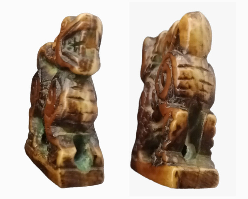 สิงห์งาแกะ สามขวัญปากเจาะ งานสิ่วแกะมือ ขนาด๒ซม. แช่สีผึ้ง ฐานจารยันต์นะมะพะทะ ไม่ทราบที่ สภาพเก่าเก็บ! |