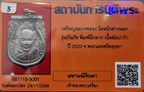 เหรียญหลวงพ่อจง วัดหน้าต่างนอก รุ่นกันภัย พิมพิ์หลังกลาก เนื้ออัลปาก้า ปี 2503 สวยเดิมๆ พร้อมบัตรรับรองครับ