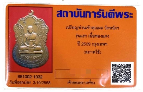 เหรียญเจ้าคุณผล วัดหนัง ปี 09 บล็อกแรกแจกทหาร เนื้อทองแดง+พร้อมบัตรรับรอง