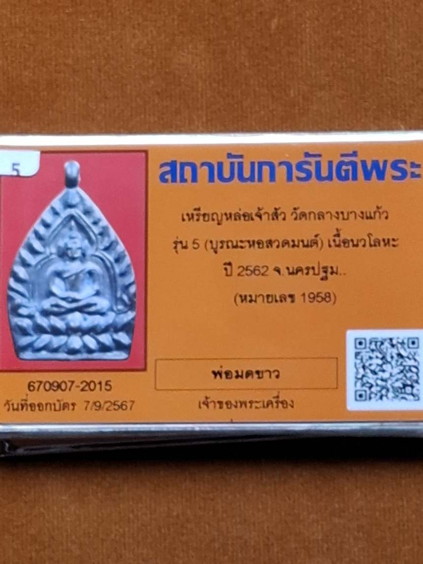 เจ้าสัว 5 วัดกลางบางแก้ว รุ่น บูระณหอสวดมนต์ เนื้อนวะโลหะ ปี62 กล่องเดิม no.๑๙๕๘ พร้อมบัตรรับรอง |