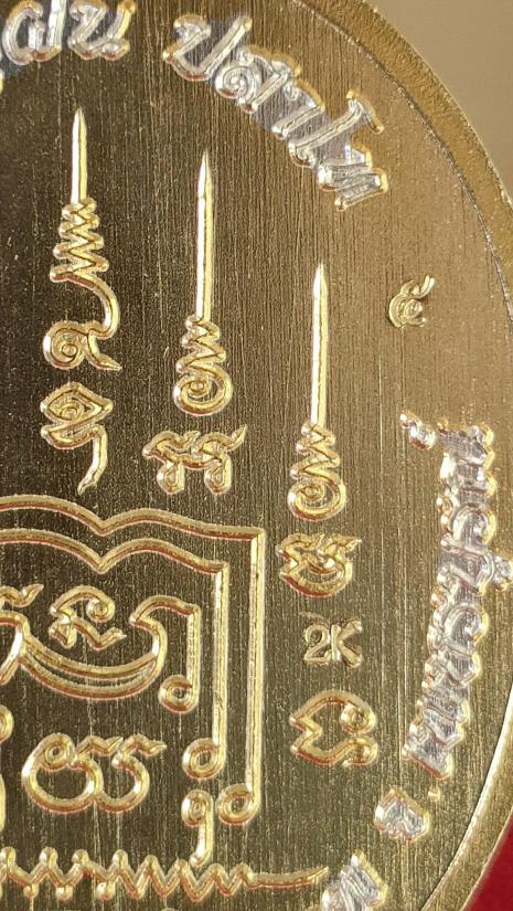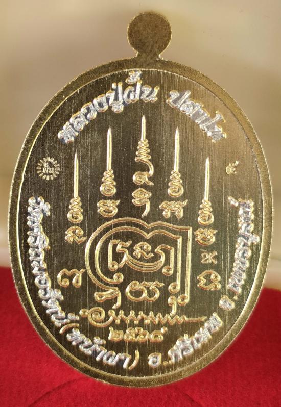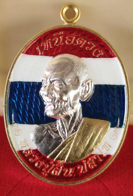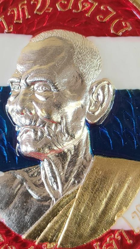 เหรียญหันข้าง"เหนือดวง" หลวงปู่ฝั้น ปสาโท วัดศรีถมอรัตน์(หน้าผา) เพชรบูรณ์ เนื้อชุบ2K คุ้ยพื้นลงยาธงชาติ หมายเลข ๕ พร้อมกล่อง เลขสวยน่าสะสมคับ (1-9ลงยาธงชาติ สร้าง9เหรียญ)