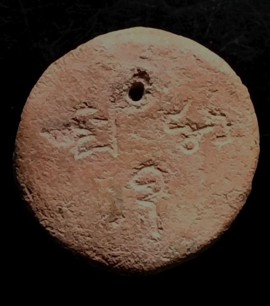 พระจันลอยเนื้อดินเจาะรูหลังมีรอยจารไม่ทราบที่ |