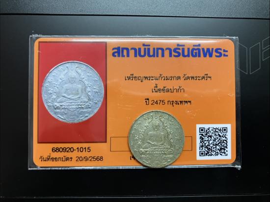 เหรียญพระแก้วมรกตปี 2475 เนื้ออัลปาก้า พร้อมบัตรรับรอง จัดส่ง ปณ EMS