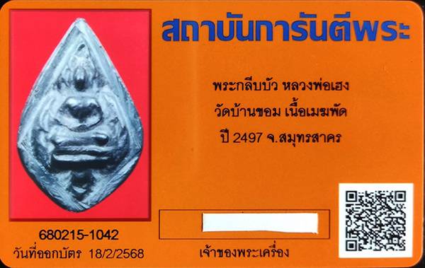 พระกลีบบัว หลวงพ่อเฮง วัดบ้านขอม เนื้อเมฆพัด พิมพ์อรุณเทพบุตร ปี2497 จ.สมุทรสาคร พร้อมบัตรG... |