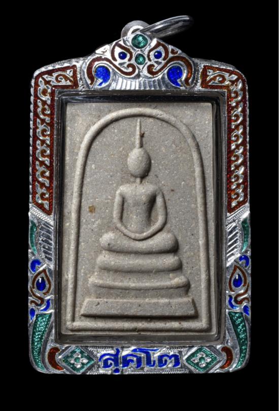 ชื่อพระเครื่อง พระสมเด็จ สุคโต ปี2517 วัดบวรนิเวศฯ กทม เลี่ยมเงินสั่งทำหนาๆ พร้อมบัตร พิเศษ มีชิ้นส่วนมวลสารจีวร ชัดๆ หน้า-หลัง 2 จุด