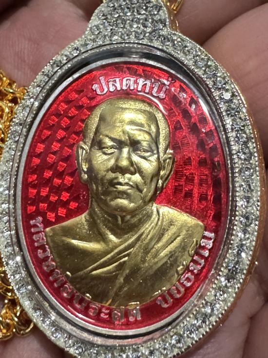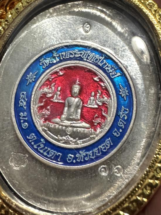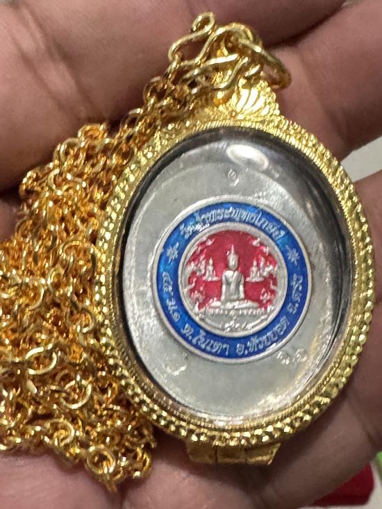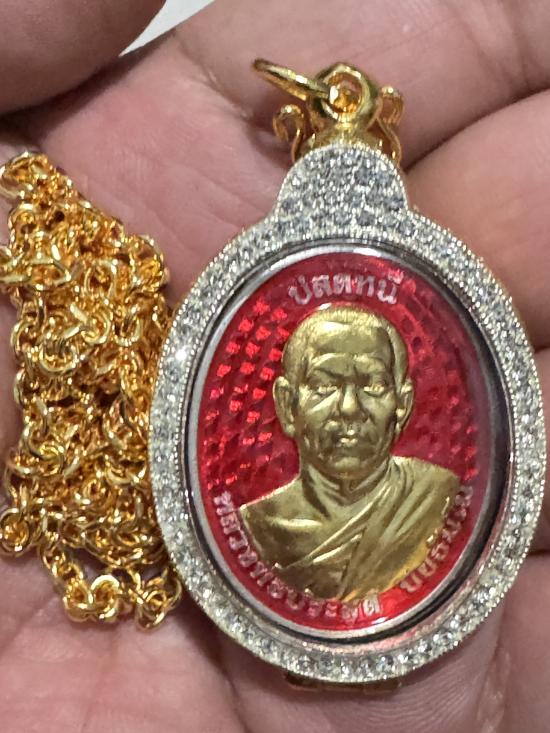 เหรียญหลวงพ่อประสูติ ปิยธัมโม วัดในเตา(วัดถ้ำพระพุทธโกษี จ.ตรัง เนื้อเงินลงยาแดงหลังลงยา หน้ากากทองคำแท้ เลี่ยมกรอบทองอิตาลีพร้อมสร้อยทอง(ทองไม่แท้)