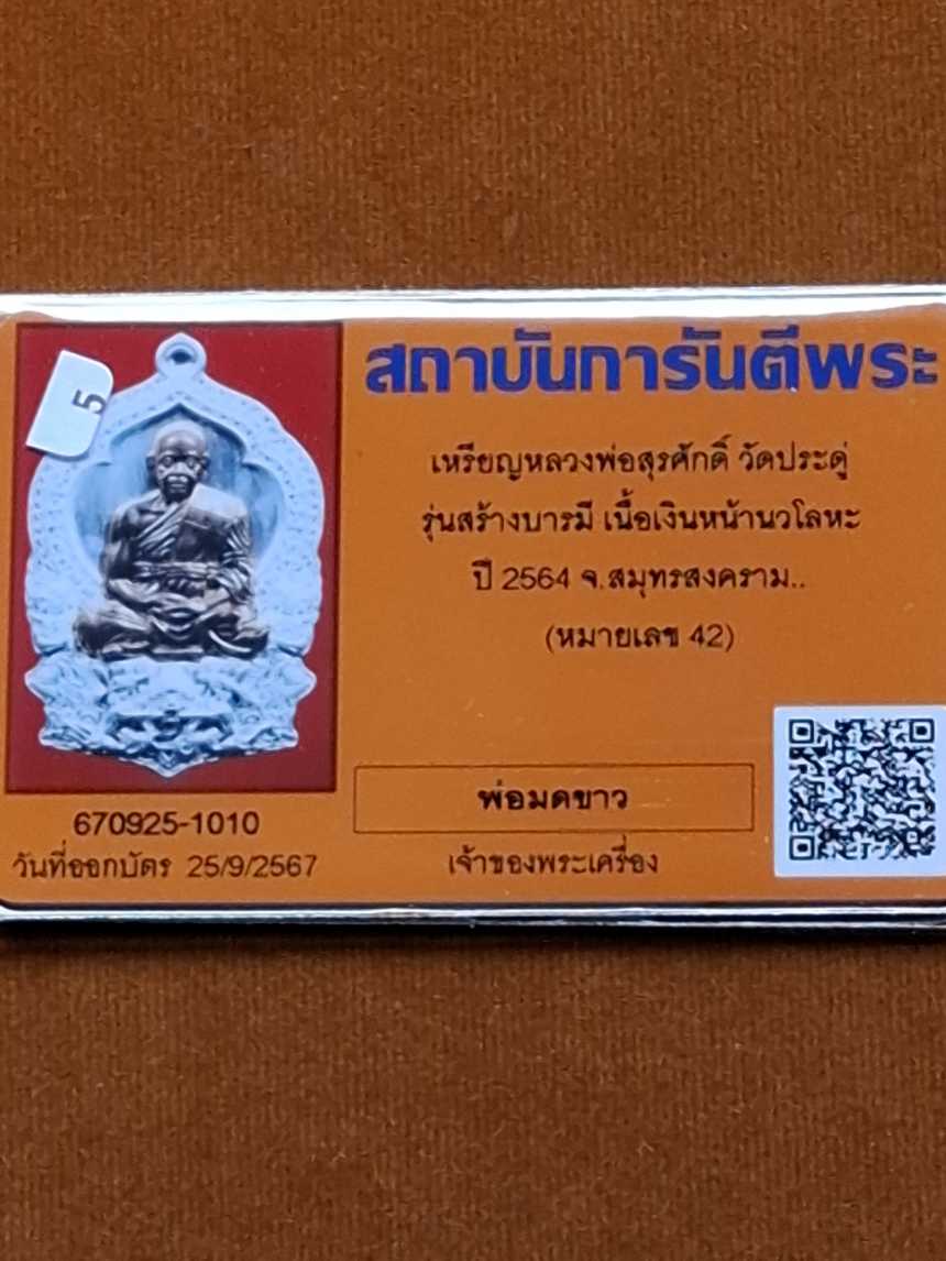 เหรียญนั่งพาน รุ่นสร้างบารมี พระมหาสุรศักดิ์ วัดประดู่พระอารามหลวง เนื้อเงินสอดเนื้อนวะโลหะ no.๔๒ กล่องเดิม พร้อมบัตรรับรองครับ