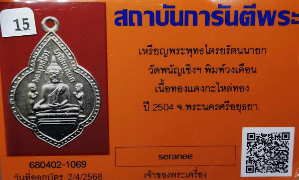 เหรียญพระพุทธไตรรัตนนายก วัดพนัญเชิง พิมพ์วงเดือน เนื้อทองแดงกะไหล่ทอง ปี 2504 พระสวย รับประกันพระแท้ตลอดชีพ มีบัตรรับรองการันตีพระ (ขออนุญาติใช้รูปเจ้าของเดิมครับ) |