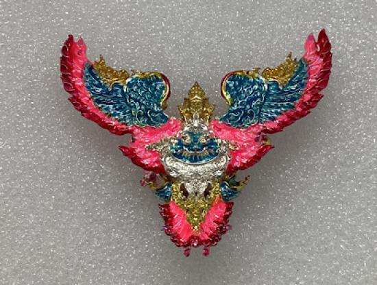 เคาะเดียวแดง 150 พญาครุฑมังรายศาสตร์ เศรษฐีอนันตทรัพย์ พระอาจารย์วิรุต วัดสันมะเหม้า จ.เชียงราย เนื้อชนวนทองขาว ลงยาองค์ชมพู สูง 4 ซ.ม. พิมพ์ใหญ่ กล่องเดิม