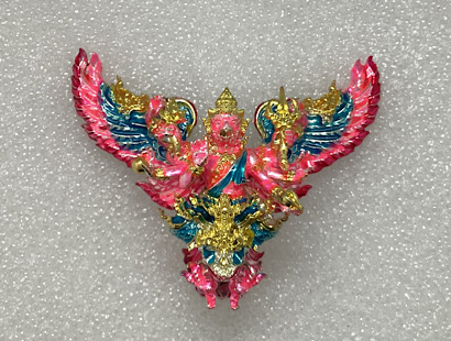 รายละเอียด พญาครุฑมังรายศาสตร์ เศรษฐีอนันตทรัพย์ พระอาจารย์วิรุต วัดสันมะเหม้า จ.เชียงราย เนื้อชนวนทองขาว ลงยาองค์ชมพู สูง 4 ซ.ม. พิมพ์ใหญ่ กล่องเดิม